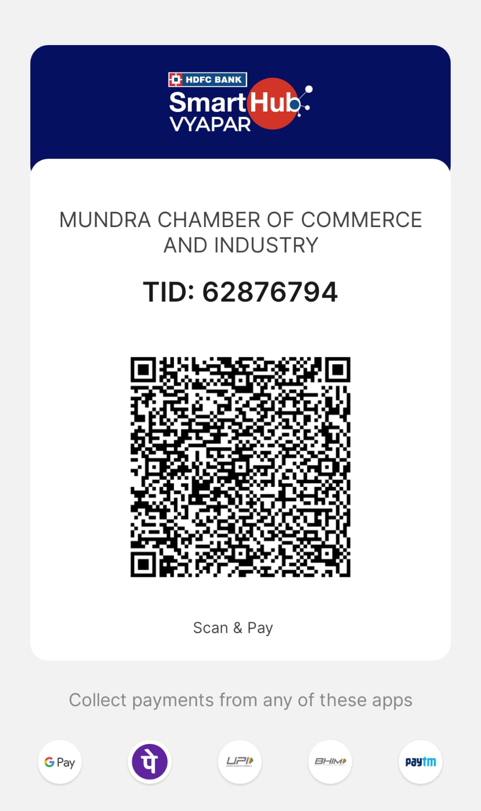 Membership Form First Name Last Name Company Name Business Type Company TypeSole proprietorshipPartnershipPrivate LimitedPublic LimitedLimited liability company (LLC)Limited liability partnership (LLP)Membership Fees - ₹1200/YearMembership Fees - ₹3000/YearMembership Fees - ₹5000/YearAddressAadhar Card No Aadhar Card FileUpload Aadhar Card File UploadCompany GST No Upload GST FileUpload Upload GST File UploadE-mail Address Password Confirm PasswordMobile Number WhatsApp number Company Contact No Website URL Company Pan Card No Company Pan Card FileUpload Company Pan Card File UploadBANK DETAILS AC NO. 50200101903890, AC NAME- MUNDRA CHAMBER OF COMMERCE & INDUSTRY, IFSC- HDFC0000577, HDFC BANK LTD MUNDRA BRANCH Or Scan QR codeTransaction Details The above information provided are true and I/ We shall be pleased, if you kindly enroll me/us as an Associate members of the MCCI.I have no objection to receive Emails/SMS's. Only fill in if you are not human